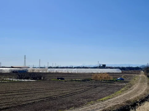 買い物に行ったら畑の開けた先に富士山が見えました。雲ひとつな...