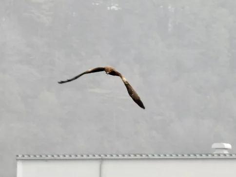 ぐずついた空模様中で飛ぶトビを見つけましたが、地面からの上昇...