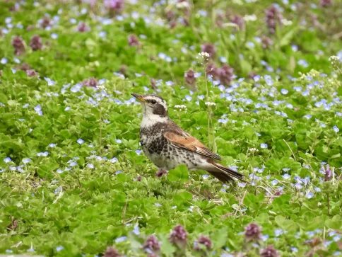 色々な花が咲いていた荒地に花見をしているようなツグミがいまし...