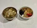 - 豆腐、きのこ、鶏むね肉、長ねぎの卵とじ