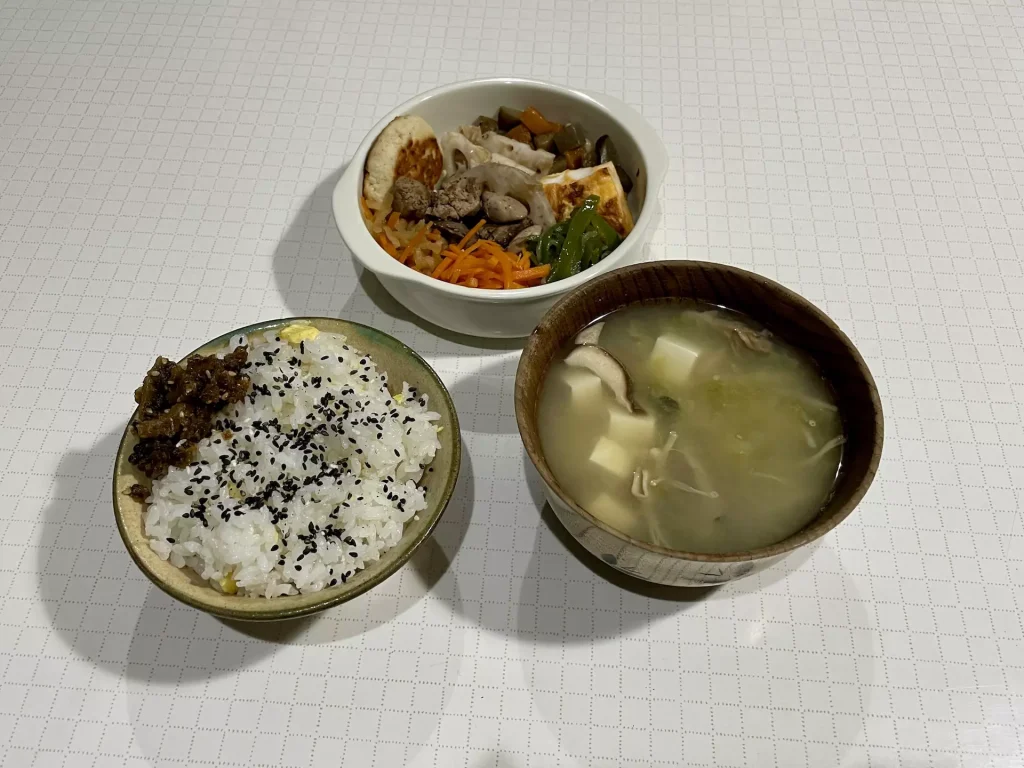 - きのこ、豆腐、あおさの味噌汁