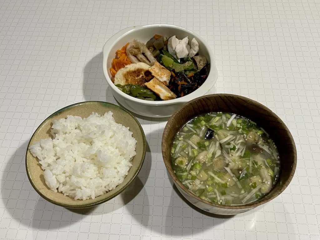 作り置きおかずをプラスしたいつも通りの夕食。ひじき煮が復活したので、おかずのバリエーションに深みが増してきました。作り置きおかずだけで10種類くらいおかずがあるので、冷蔵庫から全て出して皿に並べるだけで、正直面倒くさいなって思います。