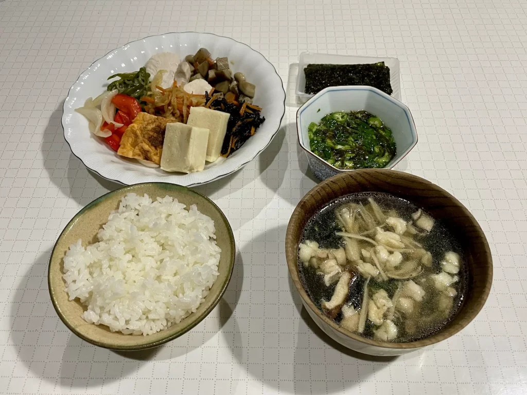 おかずを盛る皿をもう一回り大きな皿に変えてみました。意識して多くなりすぎないように盛った割にはバランスも良くていい感じ。余談ですが、先日テレビで身体に良い食材として紹介されていた半分以上が普段から食べているものだったので、そりゃ健康になるわなと改めて思いました。
