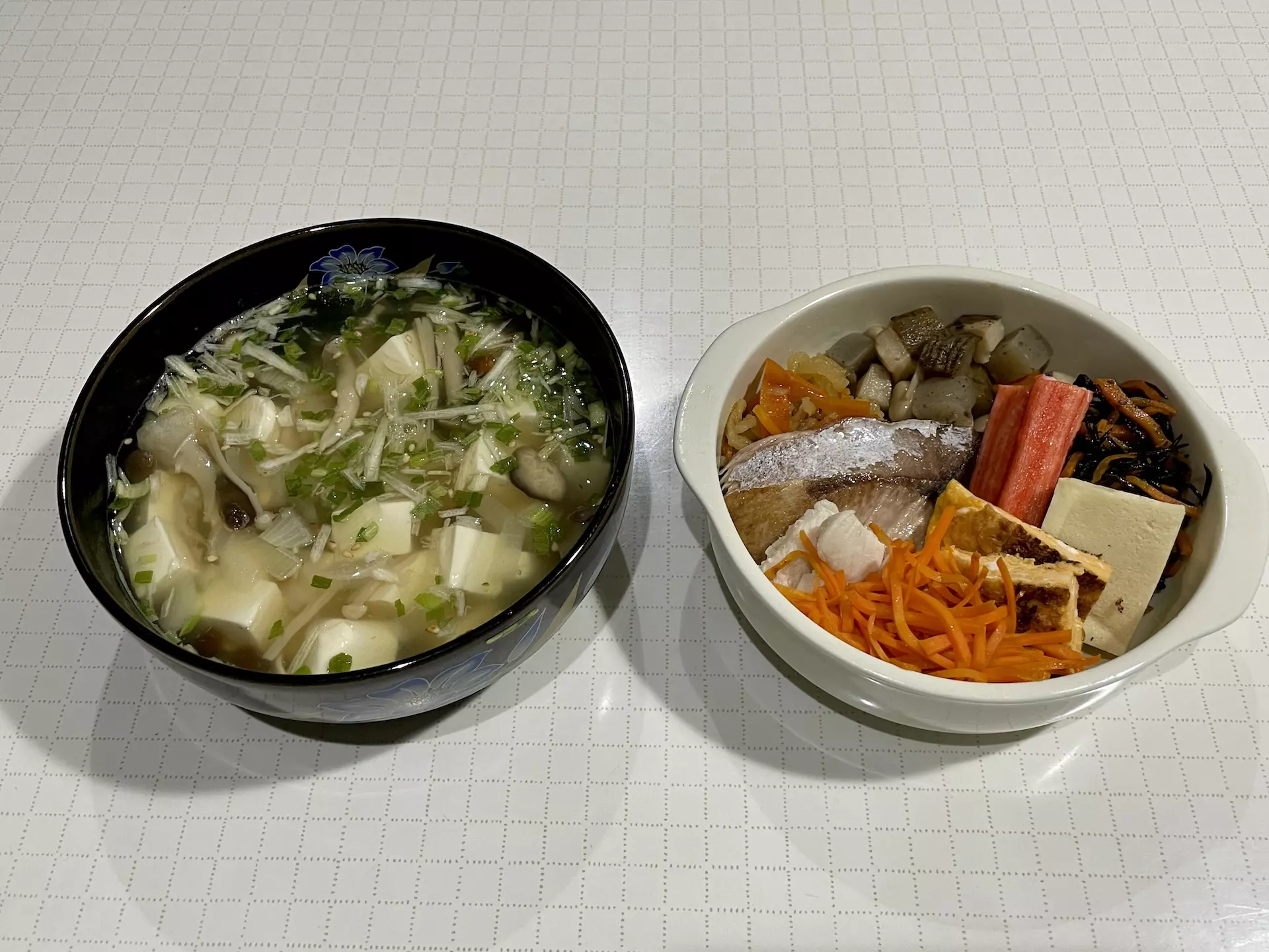 - きのこ、豆腐、玉ねぎ、わかめのお吸い物
