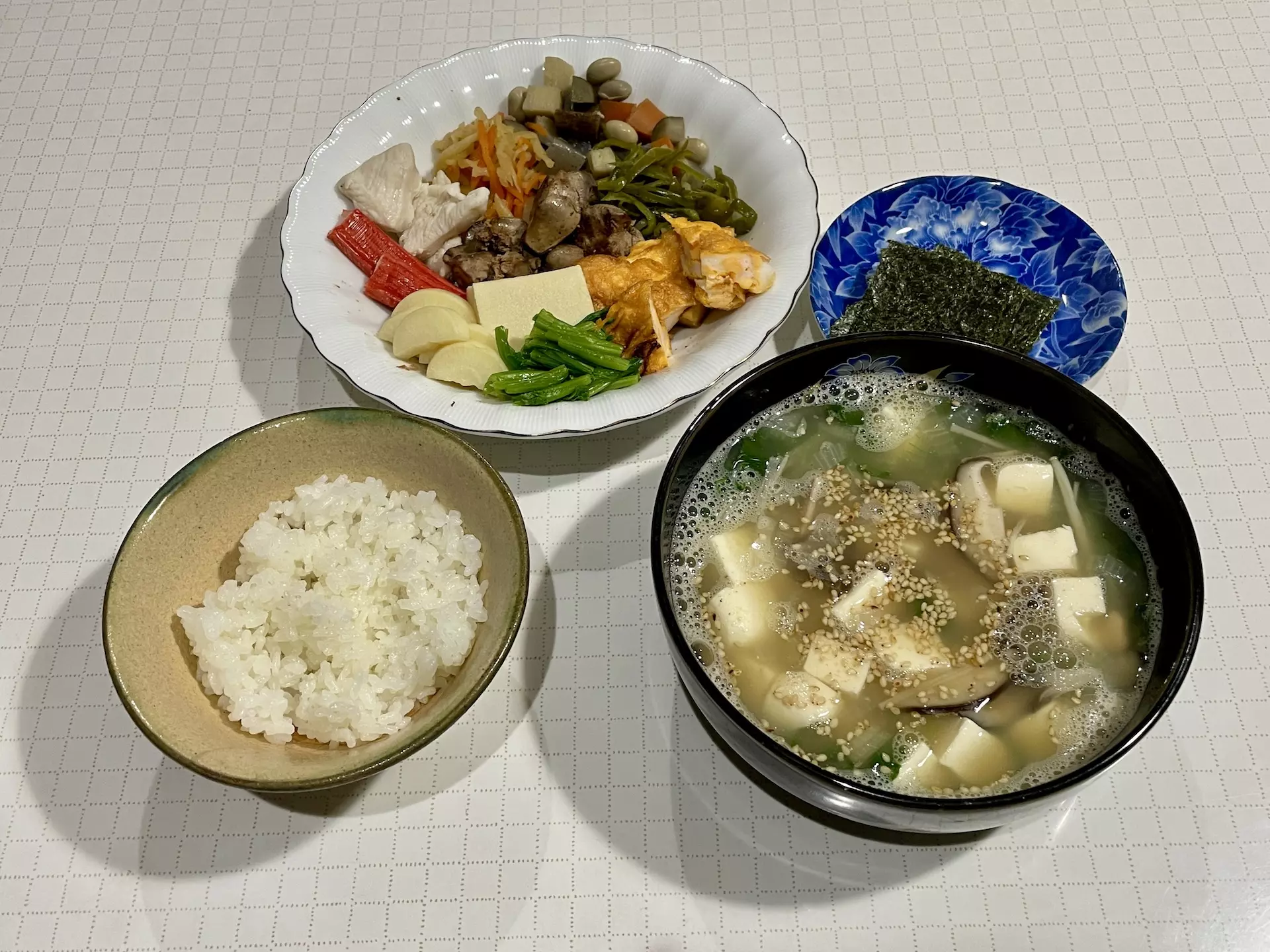 - きのこ、玉ねぎ、豆腐、大根の葉のお吸い物