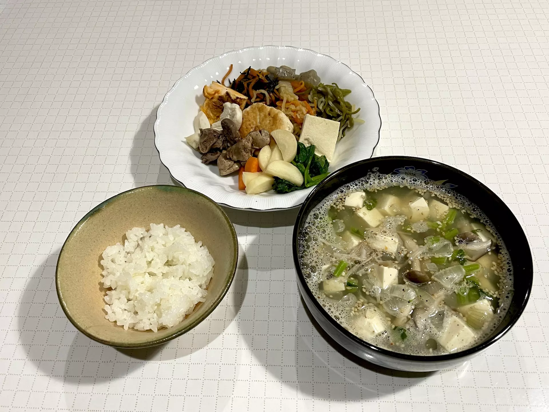 - きのこ、玉ねぎ、豆腐、大根の葉のお吸い物