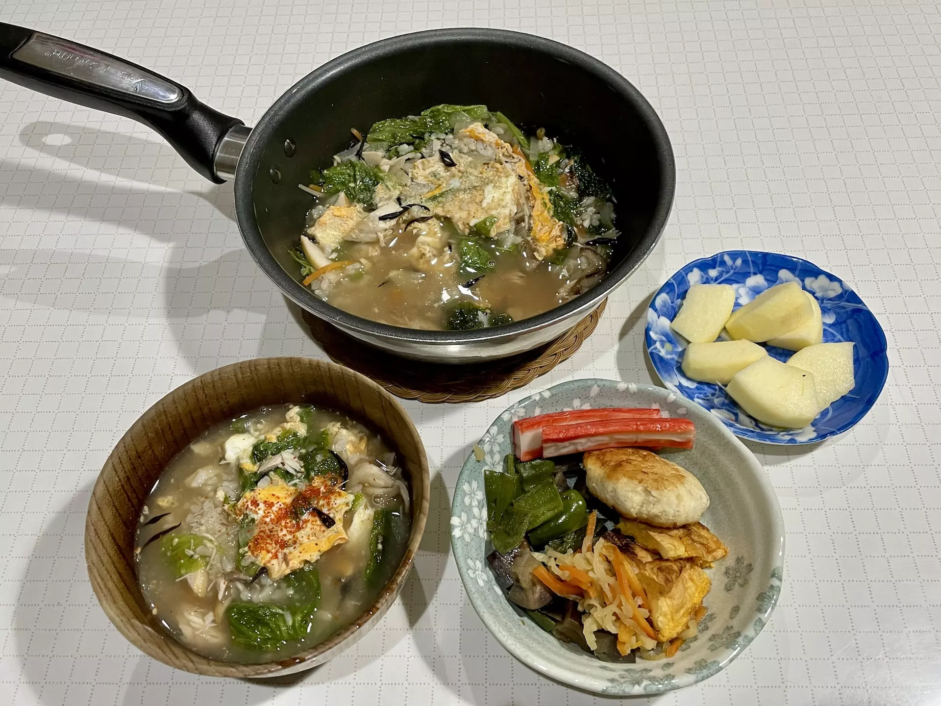 酒と移動の疲れもあって、さくっと食べられる雑炊にしました。ただ、雑炊にもミックスきのこやらひじき煮やらも入っているので、皿なのか鍋なのかが違うだけで食べる分量はあまり変わらないんですよね。しっかり寝て体力を回復して、週明けに備えたいと思います。