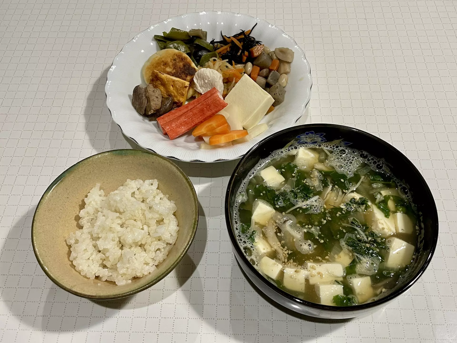 - きのこ、玉ねぎ、豆腐、大根の葉のお吸い物