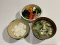• きのこ、玉ねぎ、豆腐、大根の葉のお吸い物