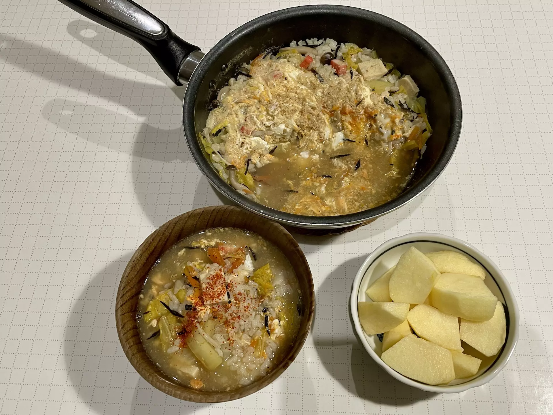 酒を飲んだせいではないでしょうが、何だかダルさが抜けないので、昼も夜も雑炊に。とは言っても、雑炊の中に入っているのは普段と同じ作り置きおかずなので、食べている内容は特に変わらず。りんごでビタミンも補給したので、明日は多少元気になってくれることを期待しましょう。