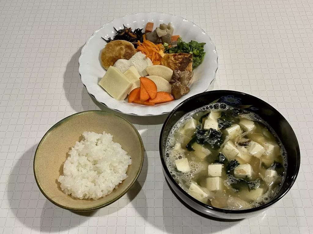• きのこ、玉ねぎ、豆腐、わかめのお吸い物