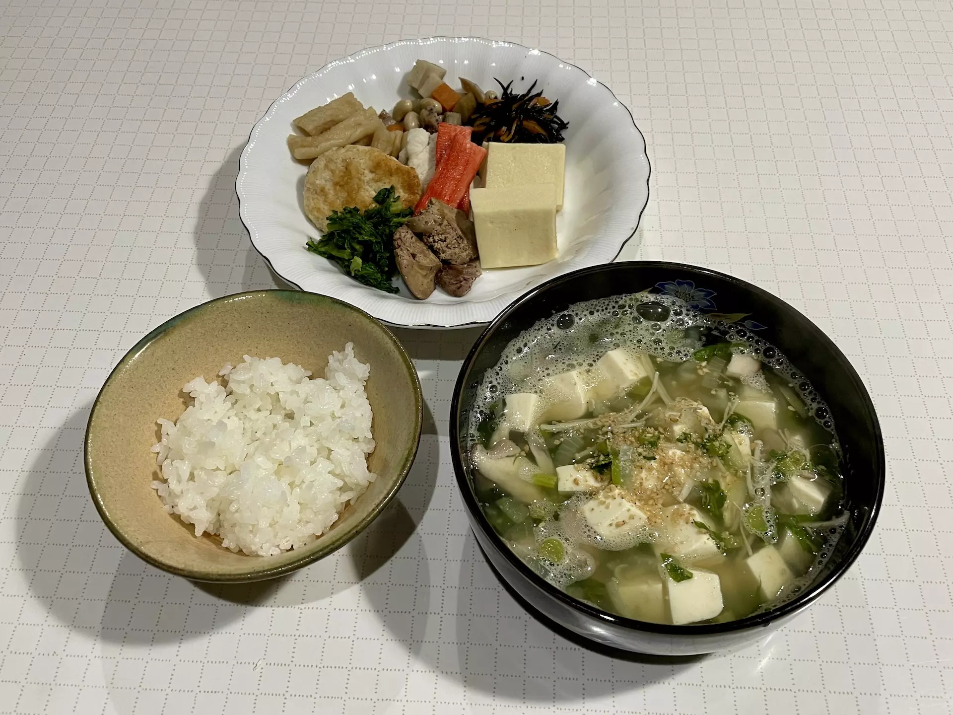 - きのこ、玉ねぎ、豆腐、わかめのお吸い物