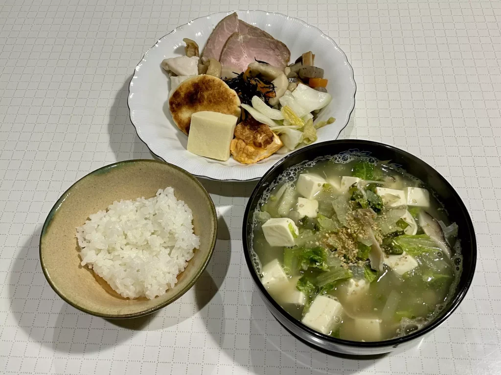 - きのこ、玉ねぎ、白菜、豆腐、大根葉のお吸い物