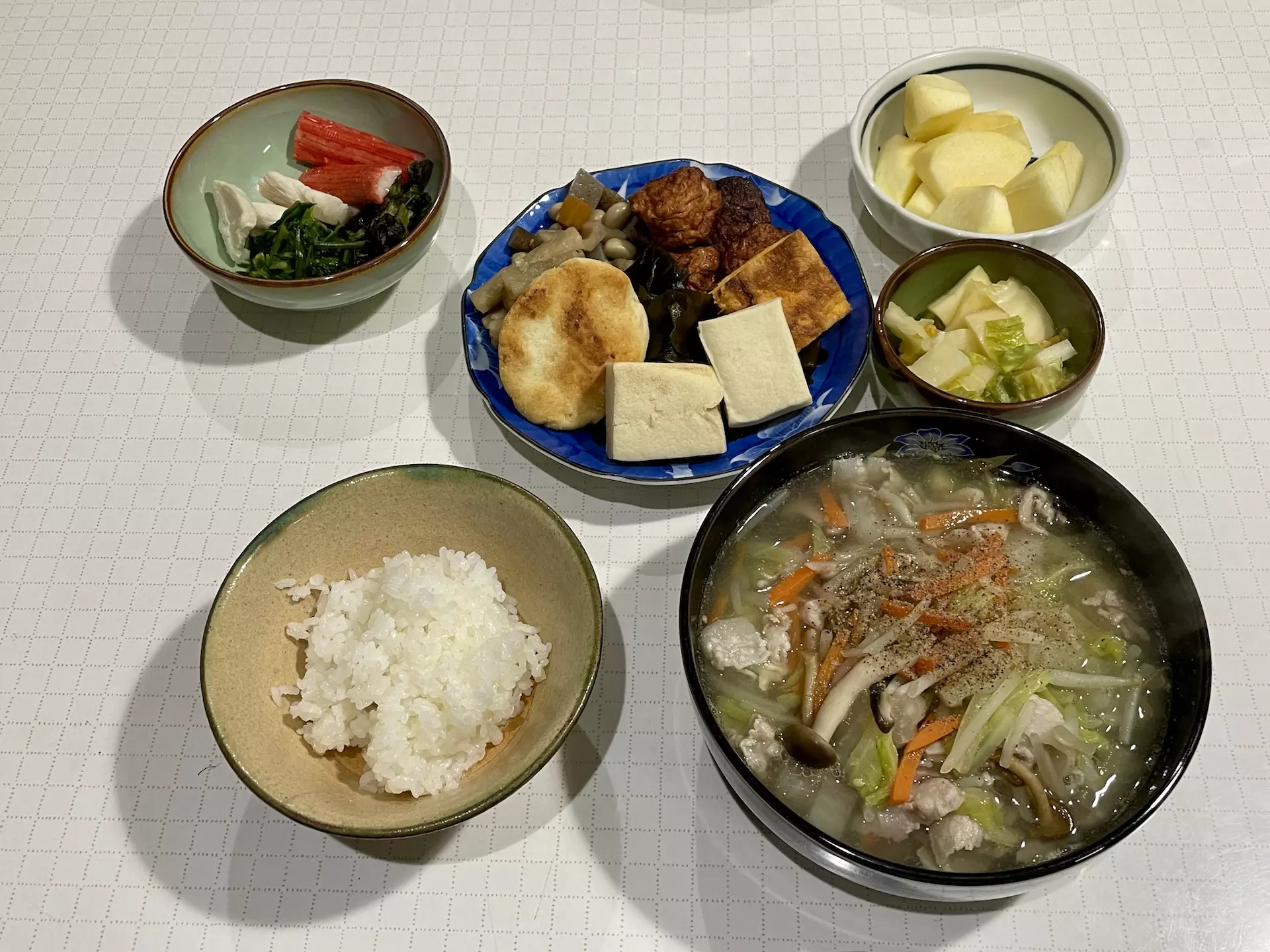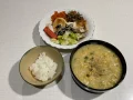 今日も母と2人の夕食で豪華な感じに。緑の野菜はおひたしと漬物くらいですが、スープに野菜がたっぷり入っているので満足感が違います。食材を何でも入れた相撲部屋のちゃんこ鍋みたいな認識ですが、やっぱり合理的ですよね。ボリュームあってもカロリーも控えめなので太りませんし。