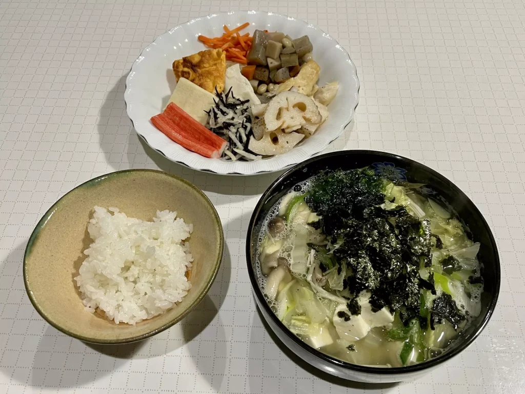 - きのこ、白菜、豆腐、海苔、あおさのお吸い物