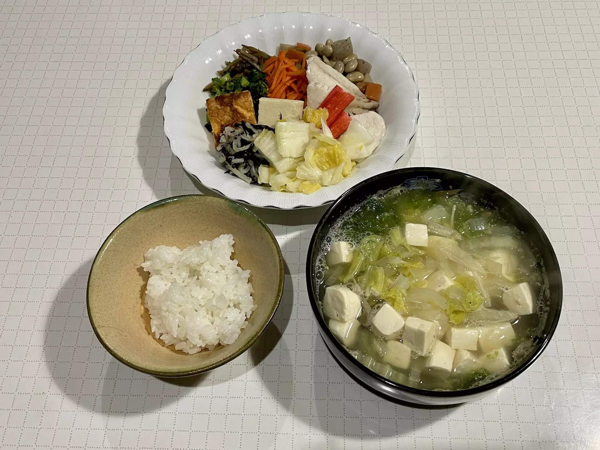 - きのこ、白菜、豆腐、あおさのお吸い物