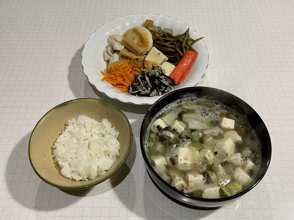 - きのこ、白菜、玉ねぎ、豆腐、焼き海苔のスープ
