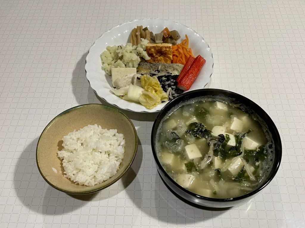 - きのこ、大根、玉ねぎ、豆腐、わかめのスープ