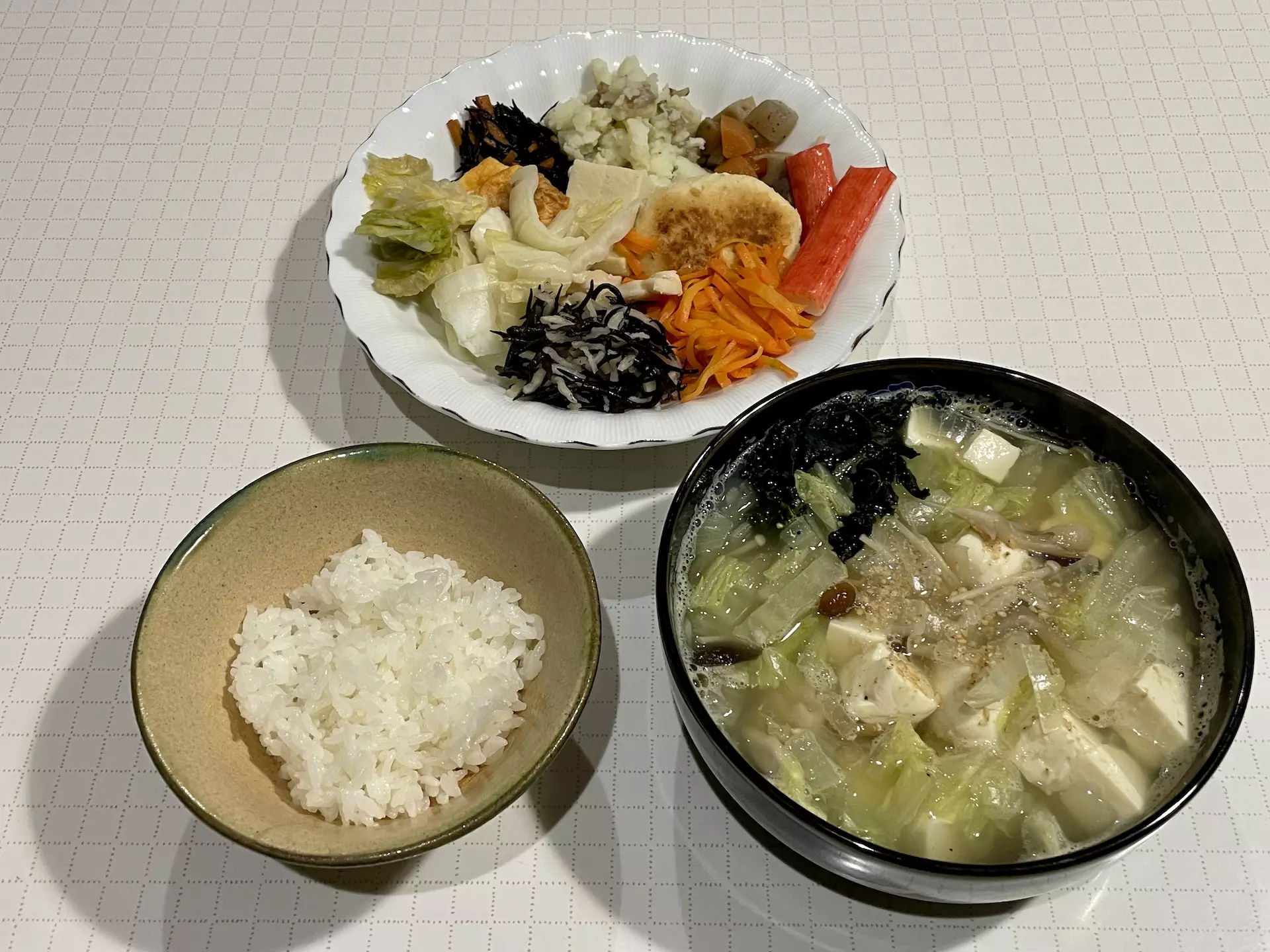 • きのこ、白菜、玉ねぎ、豆腐、わかめのスープ