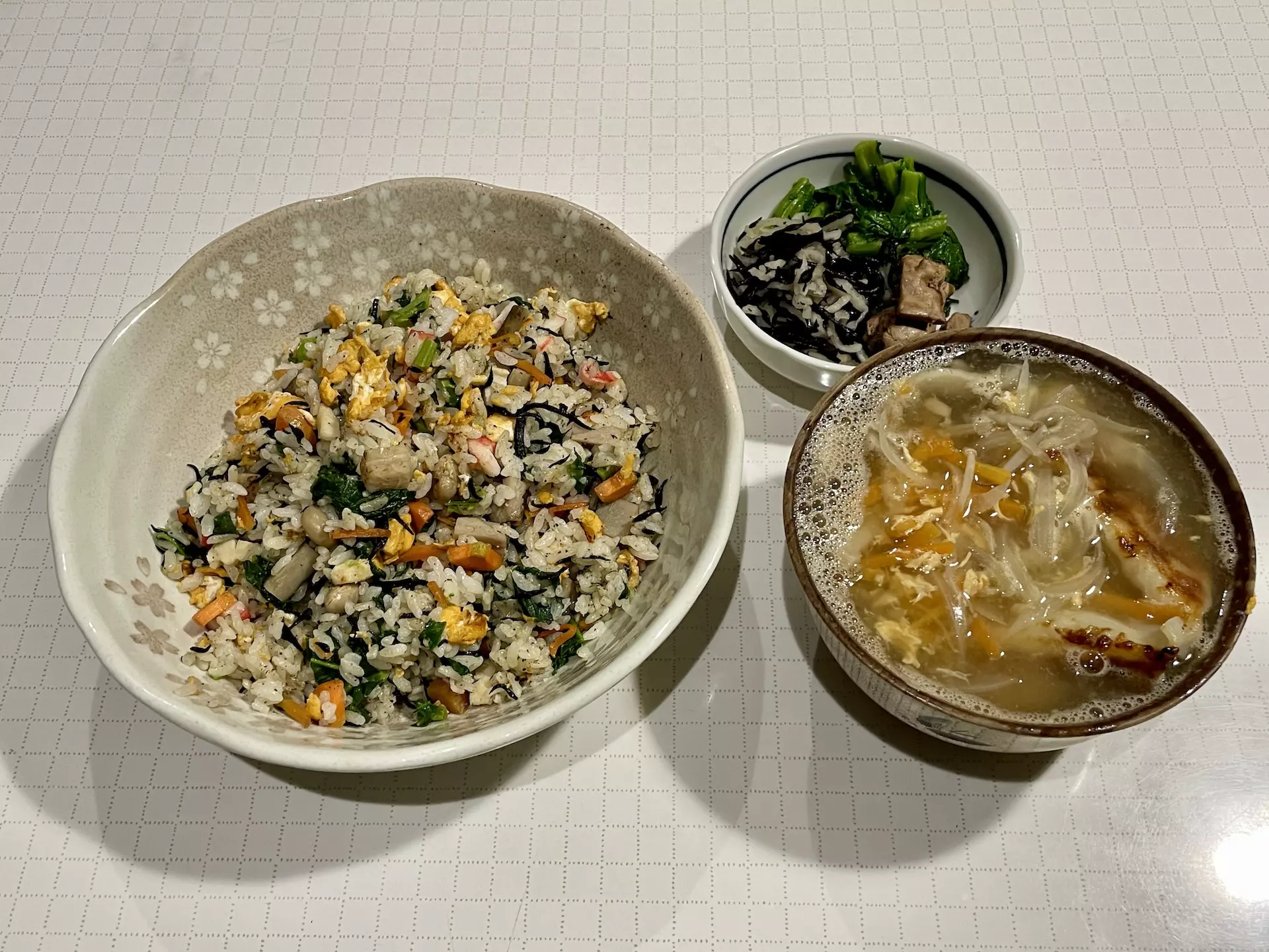 今日もまたごはんの量が中途半端だったので、おかずを入れた焼きめしに。味付けがあまり濃くないのと、どのおかずを混ぜてもあまり喧嘩しないので、面倒な時には重宝します。食べるおかずは同じでも、一品ずつ皿に盛るより一皿でドカッとまとまった方が食べるのも楽ですからね。