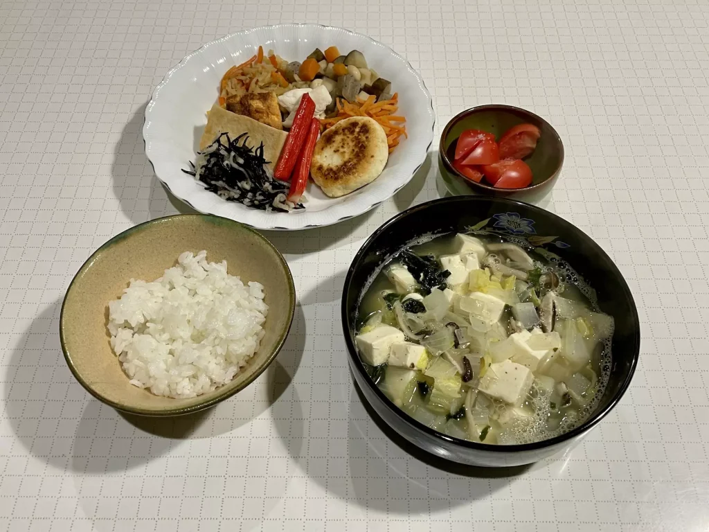 - きのこ、白菜、玉ねぎ、大根、豆腐、わかめのスープ