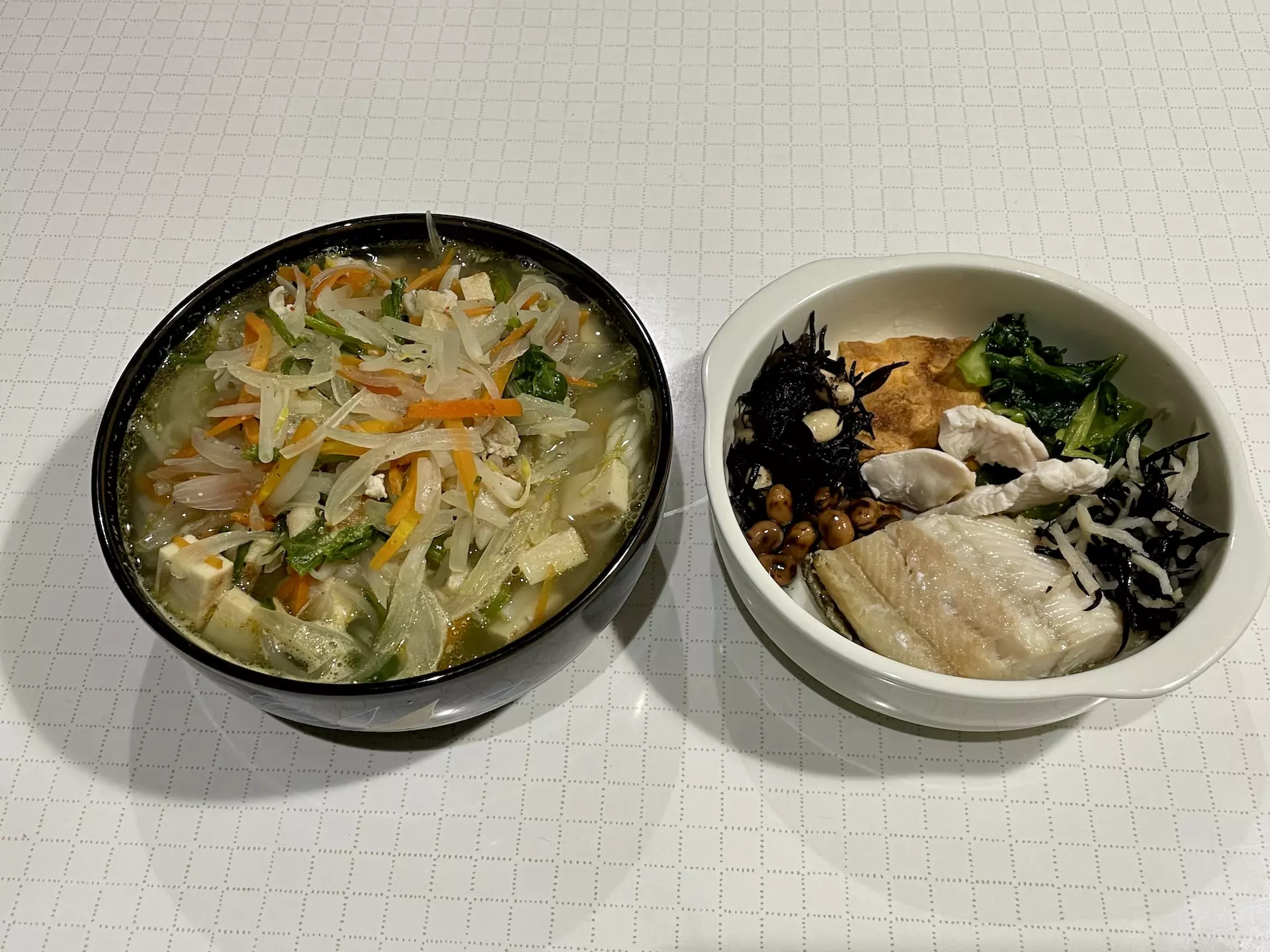 ごはんが微妙だったのでひやむぎを茹で、具沢山のスープでいただきました。おかずもバリエーション豊富でいい感じですが、体重を測ったら1kgも増えていたことに驚愕。ようやく減り始めてきた矢先なので、改めて気合を入れ直さねば。晩酌するのも今日は諦めます。