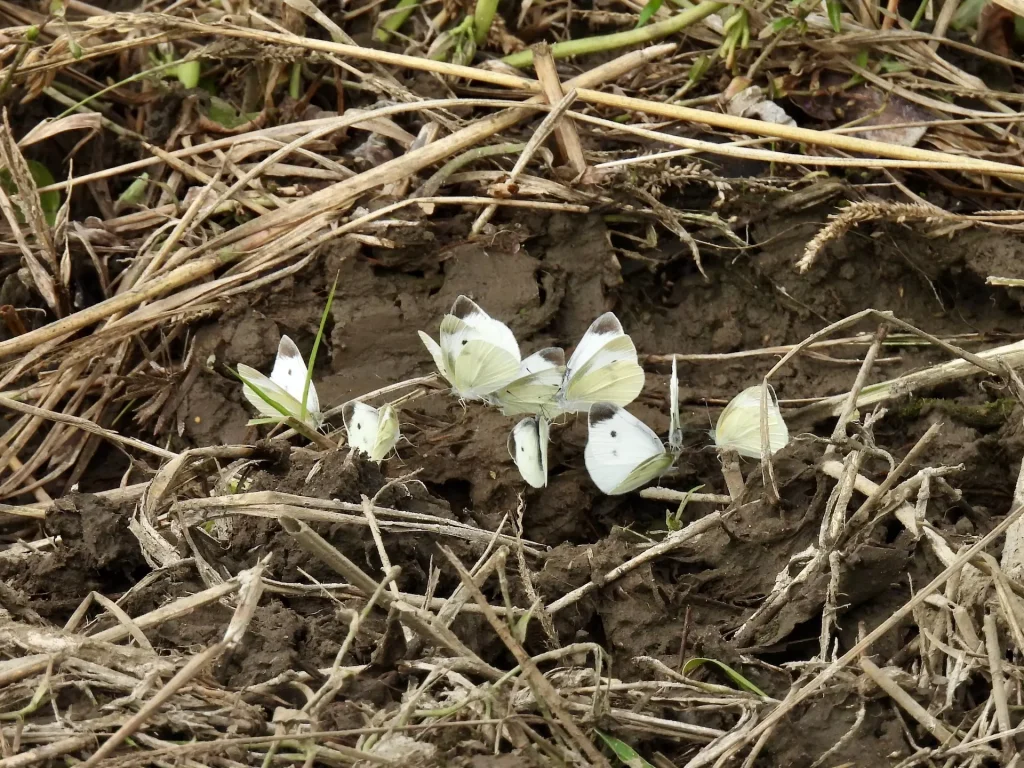 田んぼが広がる田舎道を散歩していたところ、刈り取りの終わって土起こしをした田んぼに白いものを発見。よく見ると十数羽のモンシロチョウが集まっていました。水分補給をしているのか、美味しいものでもあるのか、はたまた談合でもしているのか、真相はわかりません。