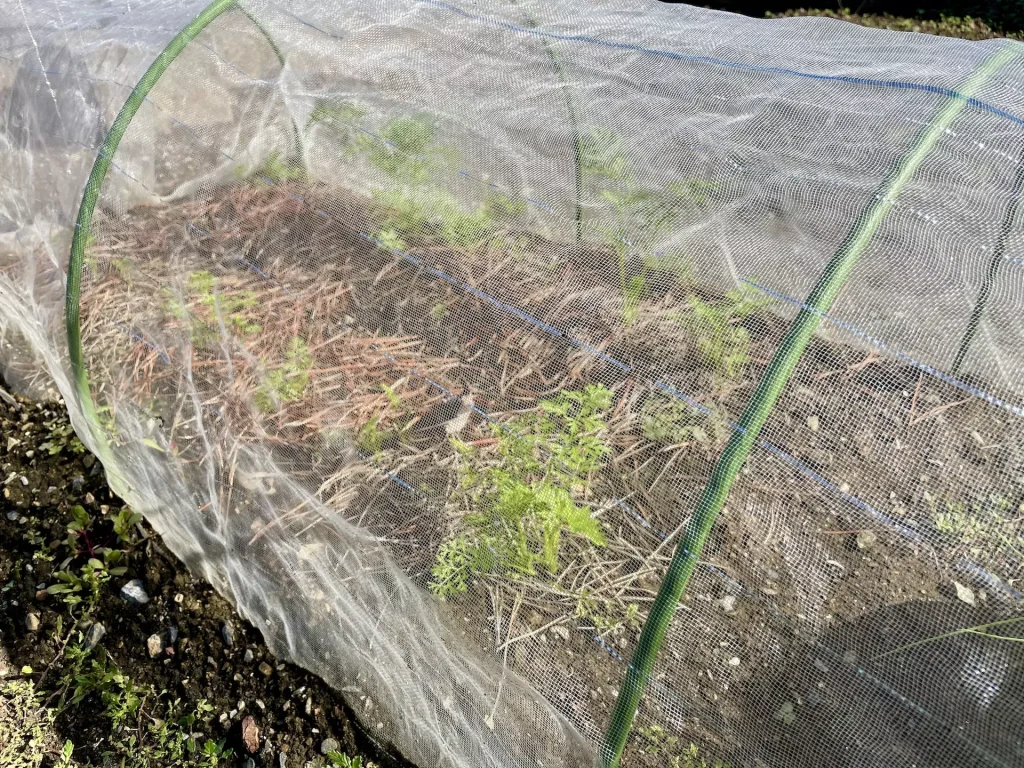 すくすく育つ大根の隣でのんびり育っているにんじん。陽が短くなってからはどうしても日陰の時間が長くなり、寒さも厳しくなってますます成長は遅くなることでしょう。結局ネットも外せぬまま冬を迎えることになりそうです。果たして、にんじんを収穫することはできるのでしょうか。