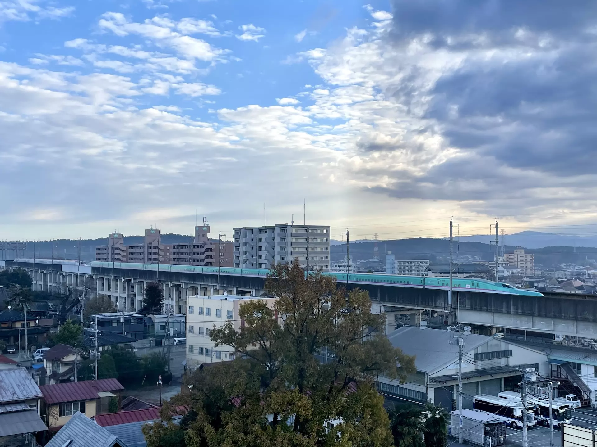 友達と飲みに出かけ、泊まったホテルの窓から新幹線が見えました。駅近ホテルではあるものの、客室が最上階で線路に面した部屋だったので、まさかここまで綺麗に見えるとは思いませんでした。それにしても、新幹線の「ヒューーーンッ!」という走り抜ける音は慣れないと異様ですね。