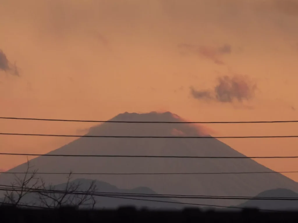 朝は氷点下まで気温が下がり、日中も空気がかなり冷たかったせいか、夕暮れ時には富士山がくっきりと見えました。電線を消すと不自然になってしまうのでそのままですが、よく見てみると斜面の凹凸も映っています。これから寒くなるにつれ、はっきりと見えてくる景色が楽しみです。