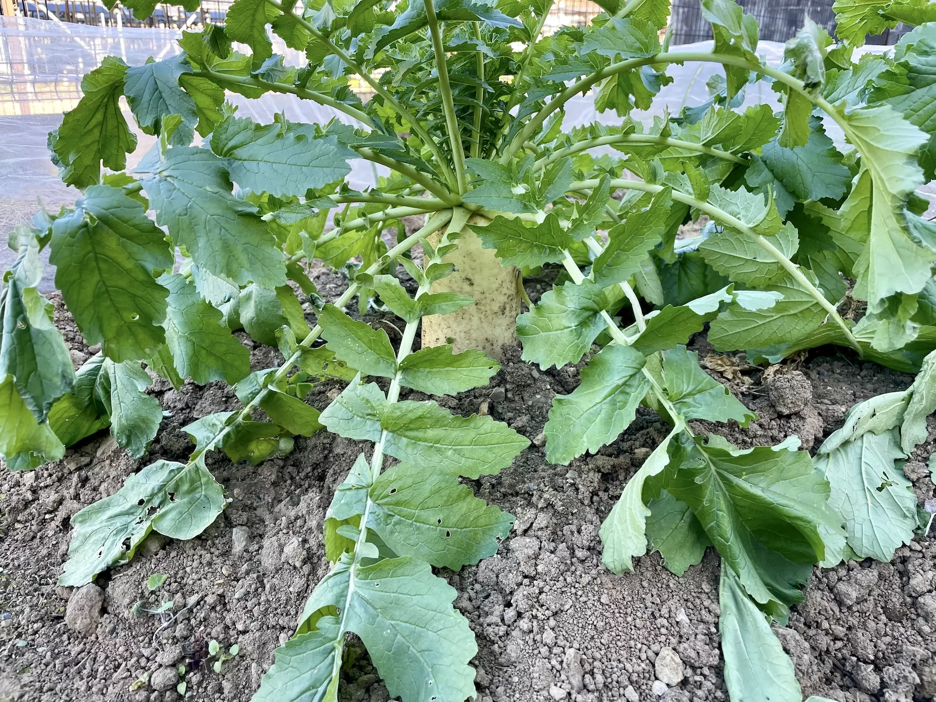 週1本のペースで使っている大根ですが、成長し過ぎてしまい20cmくらい地面から出てきてしまっています。9月上旬に種を蒔き、既に3ヶ月以上が経っているので、土も固くなってどんどん上がってきてしまうんですよね。代わりに長さも太さもすごいので、明日抜いて確かめてみましょう。