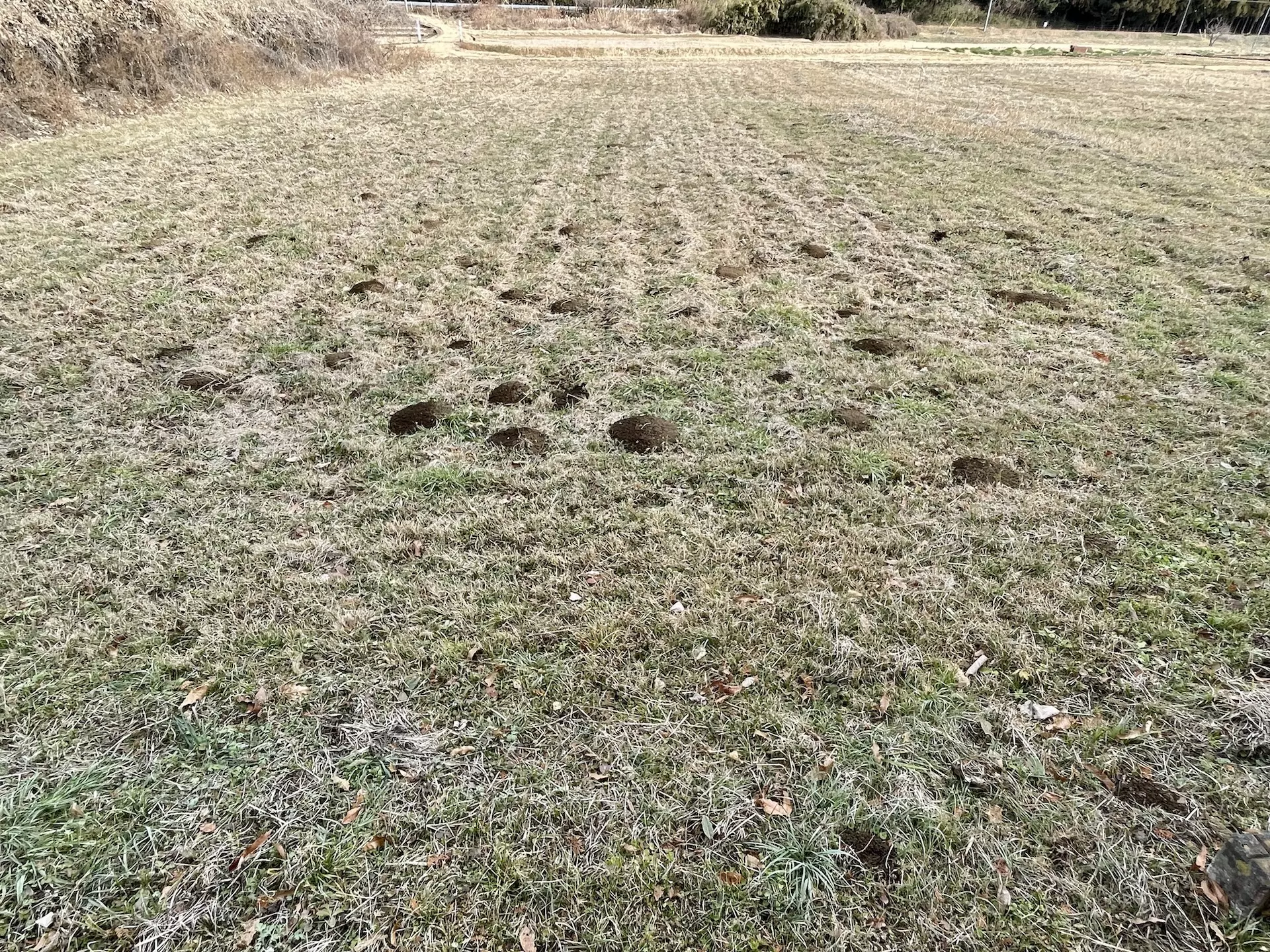散歩をしていたら空き地に謎の凸凹を無数に発見。田舎に住んでいる人には分かると思いますが、もぐらが穴を掘った跡ですね。地中の生き物などを食べているようで、あちこちがボコボコです。ちょいと調べてみたら、ペットボトルの風車もモグラよけの装置だったんですね。知らなかった。
