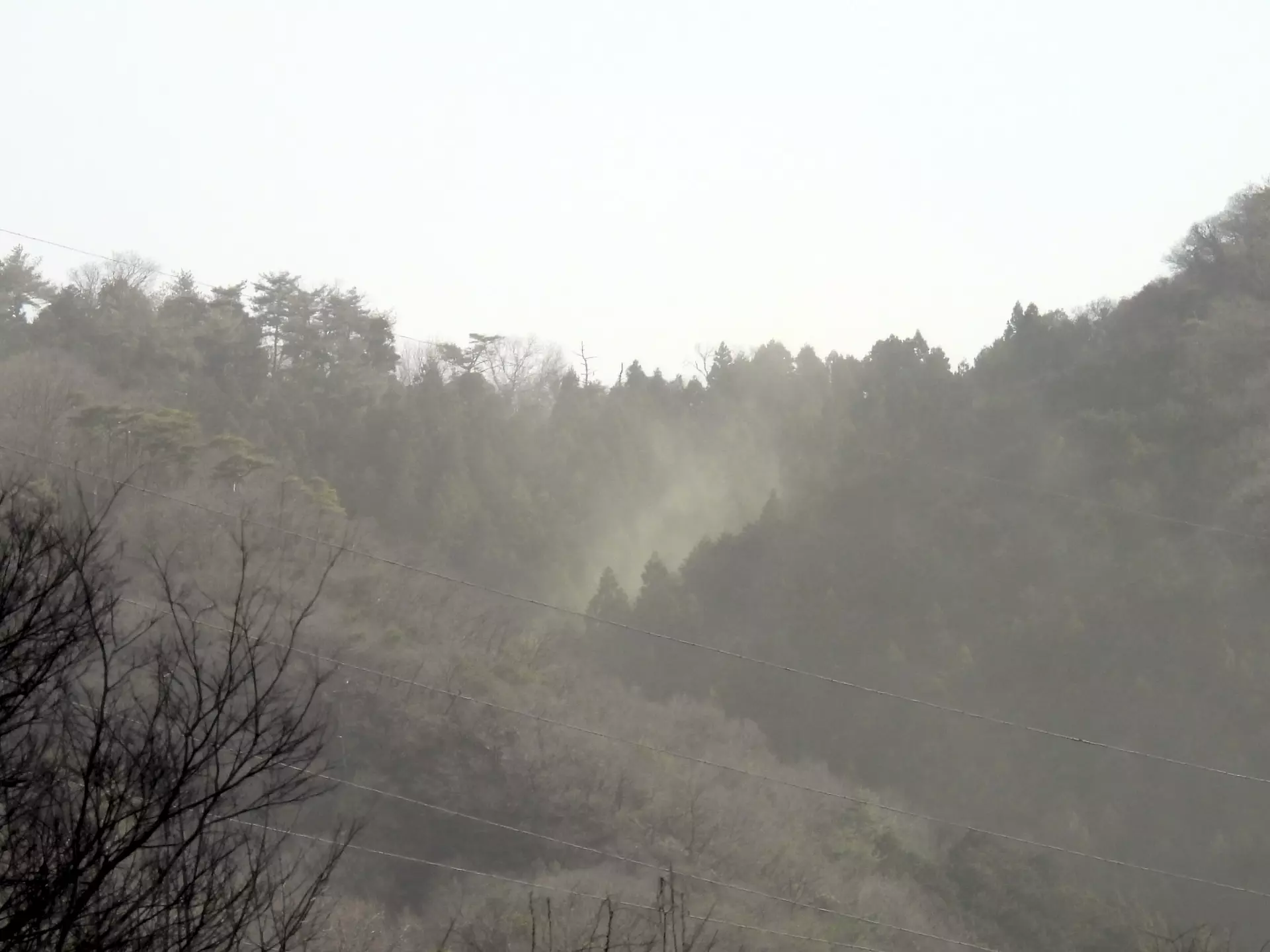 午前中から気温が高く、午後になって風が出てきたので、山にはスギの花粉がもうもうと立ち込めていました。写真では分かりにくいですが、中央の黄色く煙った場所が大量のスギ花粉が飛散している場所です。4年やった舌下免疫療法のおかげで、今は他人事として過ごせて本当に楽ですね。