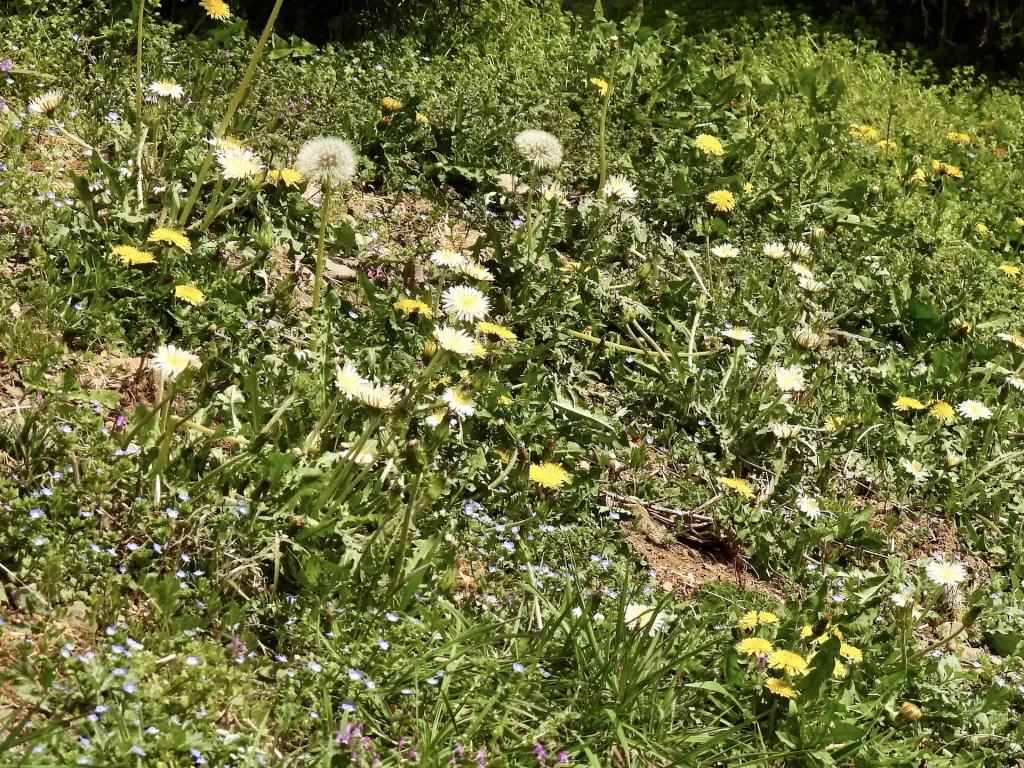 一段高くなった工場の法面に黄色と白のタンポポが仲良く咲いていました。黄色い方は花の感じからおそらくセイヨウタンポポ、白い方はシロバナタンポポかと思われます。他にもオオイヌノフグリやホトケノザなども咲いて春らしい一枚に。散歩に行くたびに風景が変わるのは面白いですね。