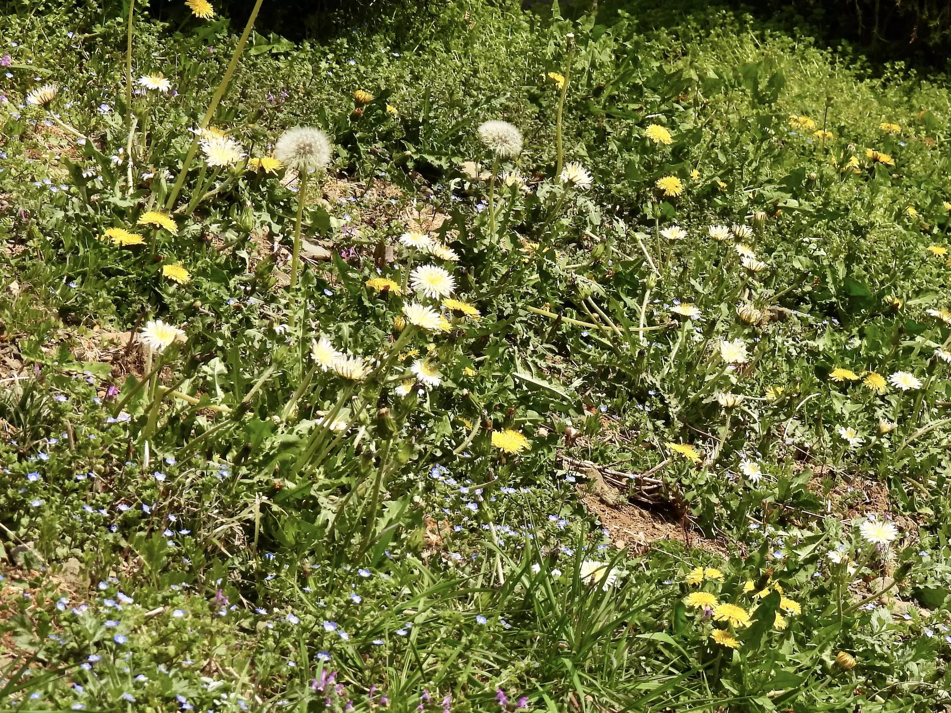 一段高くなった工場の法面に黄色と白のタンポポが仲良く咲いていました。黄色い方は花の感じからおそらくセイヨウタンポポ、白い方はシロバナタンポポかと思われます。他にもオオイヌノフグリやホトケノザなども咲いて春らしい一枚に。散歩に行くたびに風景が変わるのは面白いですね。