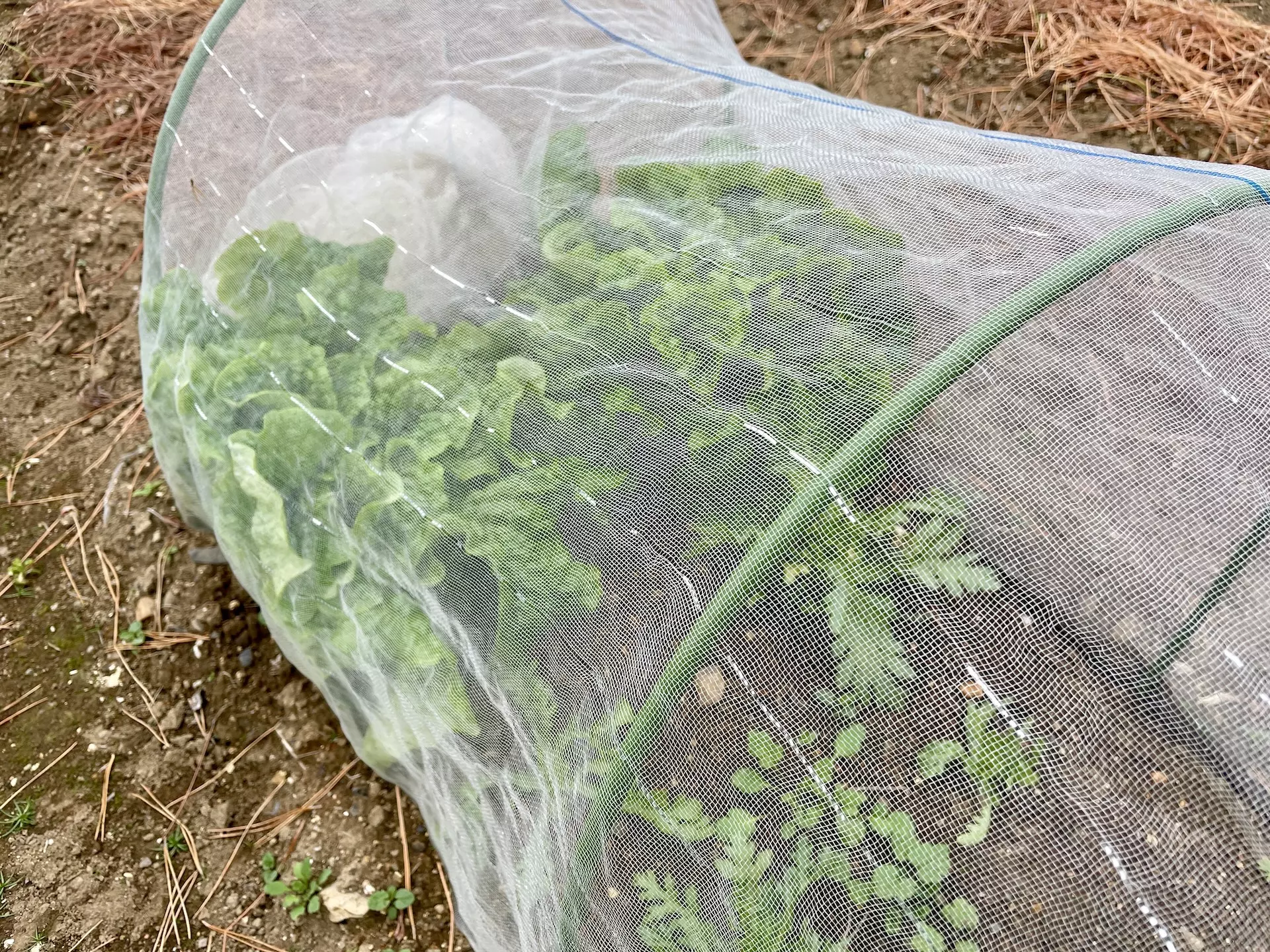 10月下旬に植えたサンチュと春菊を、特に何もせぬまま早2ヶ月。サンチュに関してはかなり立派に成長しています。一方の春菊は水をやらずに枯れかけたものが復活してを繰り返し、大して成長していません。窮屈そうですがネット外すと霜にやられるし、考えものですね。。。