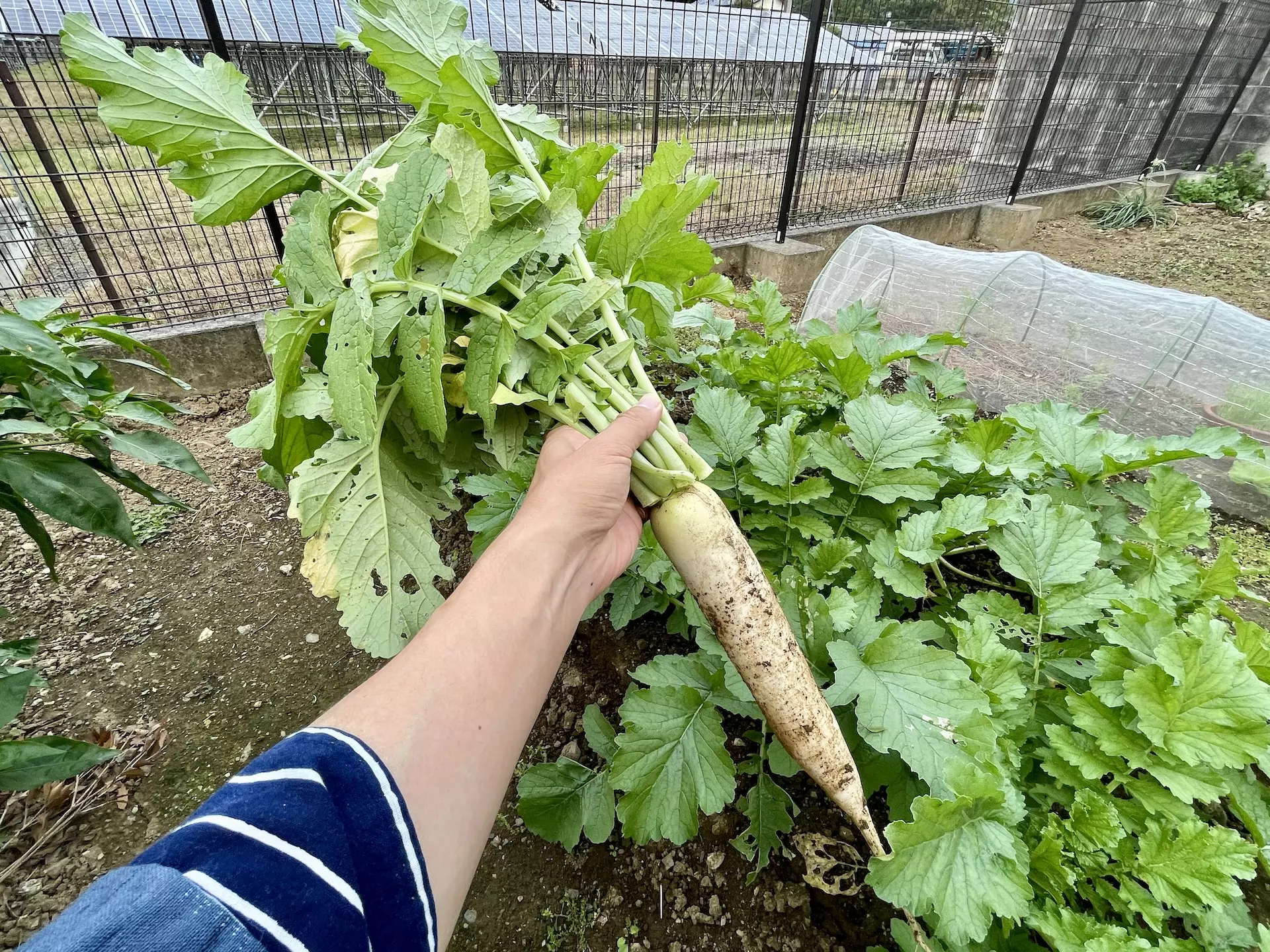 大根のうち1本が地中で石に当たったのか上がってきてしまったので、少し早めですが抜くことにしました。少々小ぶりですが順調には育っているみたいです。葉はおひたし、茎は浅漬け、根はぬか漬けとそれぞれさくっと調理しました。他の大根はもう少し大きくなってから順に抜きます。