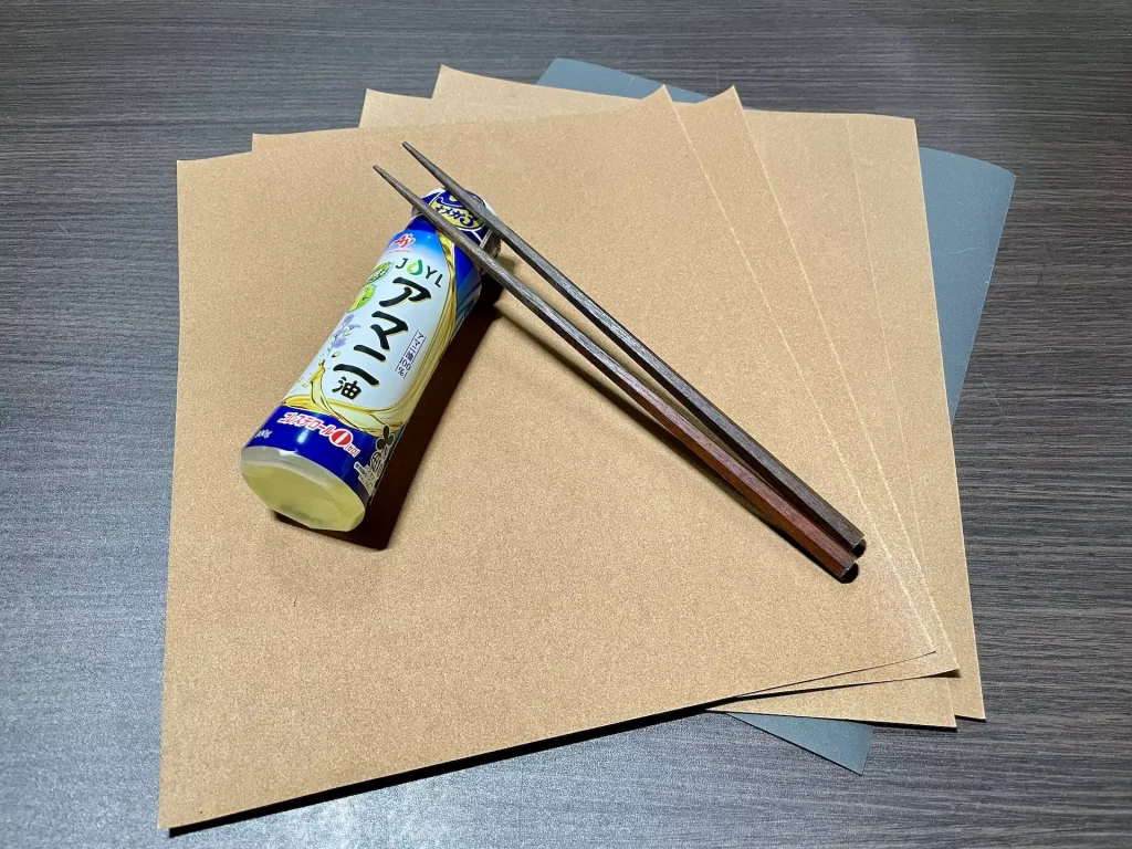 先の細い箸を作るため、紙やすりとアマニ油を買ってきました。箸の素材はよく分かりませんが、一膳50円くらいの安物なので、失敗しても別にいいかなと。紙やすりで全体的に細く削り、滑らかにしてオイルを塗るという工程です。やる気が出た時に試したいと思うので、しばしお待ちを。