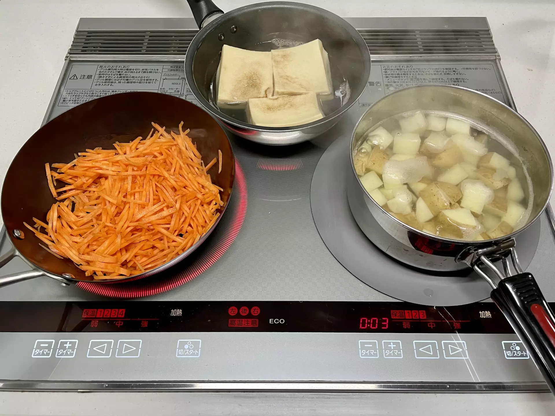 まとめておかずを作っていたら、3つのIHヒーターが鍋で埋まってしまいました。高野豆腐もじゃがいもも鍋に入れてタイマーで煮るだけなので、実質調理しているのはにんじんだけですが。思いの外手際よく調理ができたので、3品作って30分くらい。明日は何もしなくていいから楽だ。