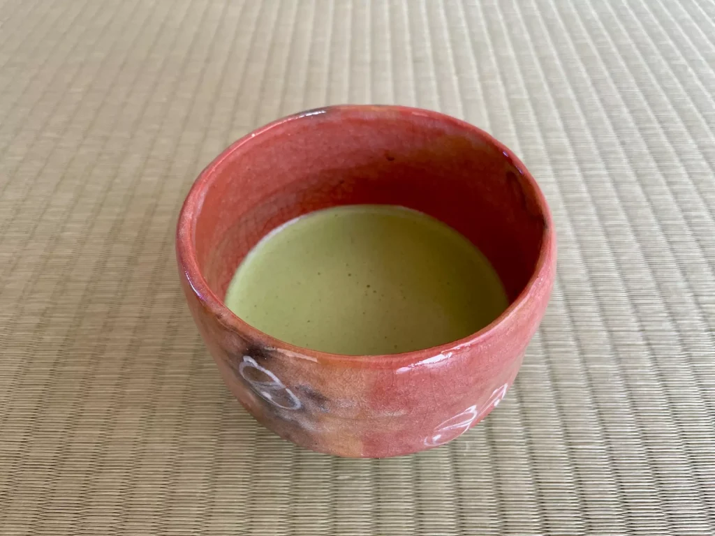 今日の茶碗は鈴の描かれた赤楽です。軽くて手におさまる程よい大きさで、かなり使い込まれているので点てやすい碗です。茶碗の正面左側の色がかせていますが、去年あたりから一気に茶碗が変化して深みが出てきました。どこでどのように変わるか、予測もつかないのが面白さですね。
